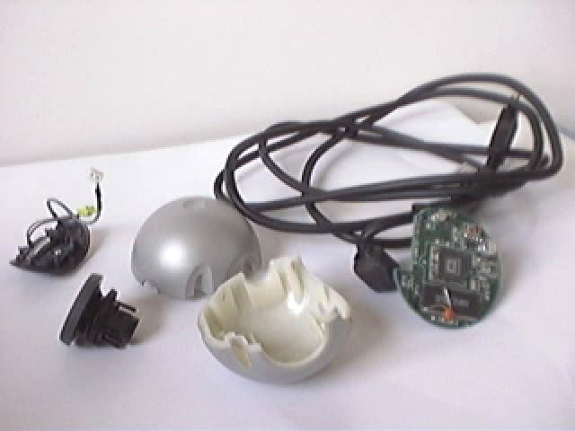 Both of our CCD cameras were cobbled together out of webcams, the Logitech Quickcam Pro 3000. If you open one up (this voids the warranty!) you get bits like these. The CCD chip is mounted in the middle of the small circuit board. The one here is actually from an older quickcam no longer in use; otherwise we wouldn't let it sit out collecting dust like this.